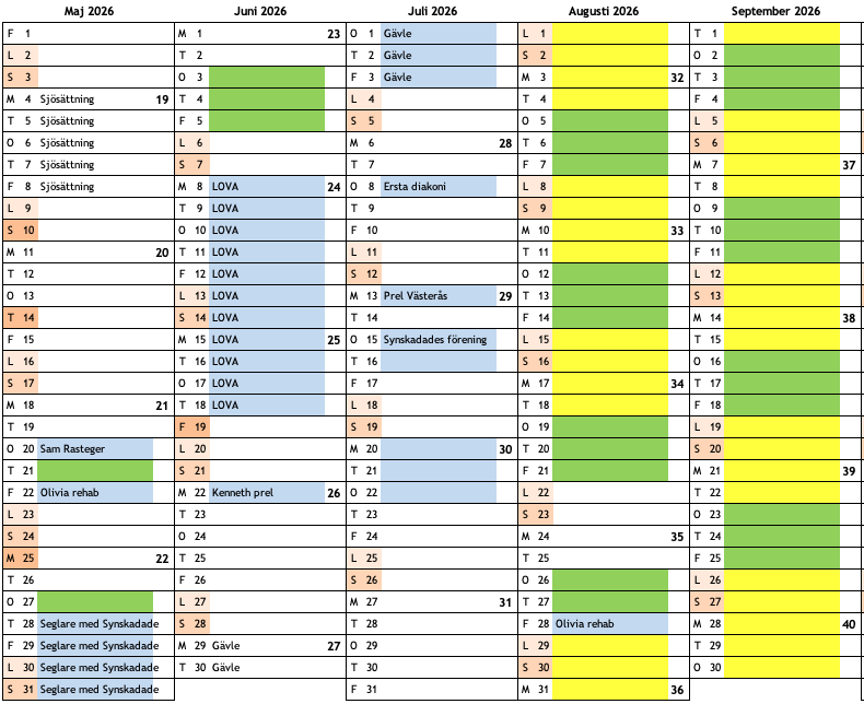 Överstrukna är redan fullbokad Men dom gröna datumen är fortfarande öppna för bokning.